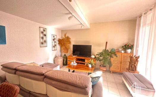 L’espace de vie, d’environ 30 m², s’articule autour d’un séjour convivial et d’une cuisine moderne, aménagée et équipée, idéal pour partager de beaux moments en famille ou entre amis. La grande baie vitrée exposée sud-est baigne l’ensemble de lumière naturelle tout au long de la journée.